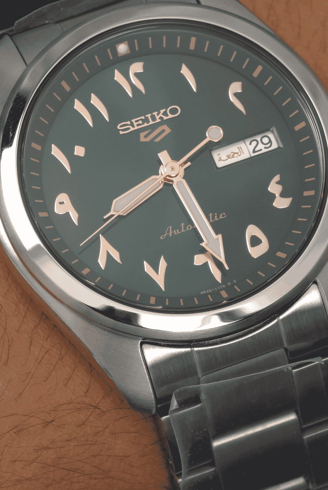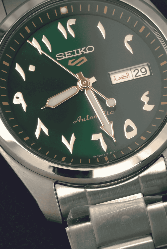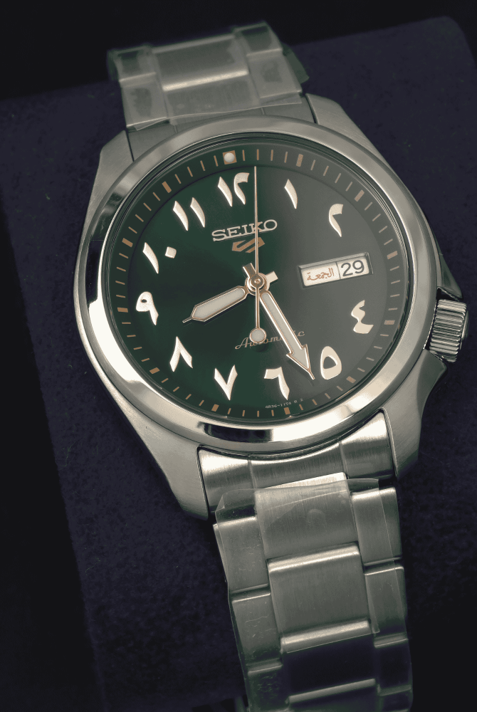 ميناء أخضر فاخر بأرقام عربية أصيلة، تجمع بين الهوية المميزة والعملية بحركة أوتوماتيكية ومقاومة ماء 100م
