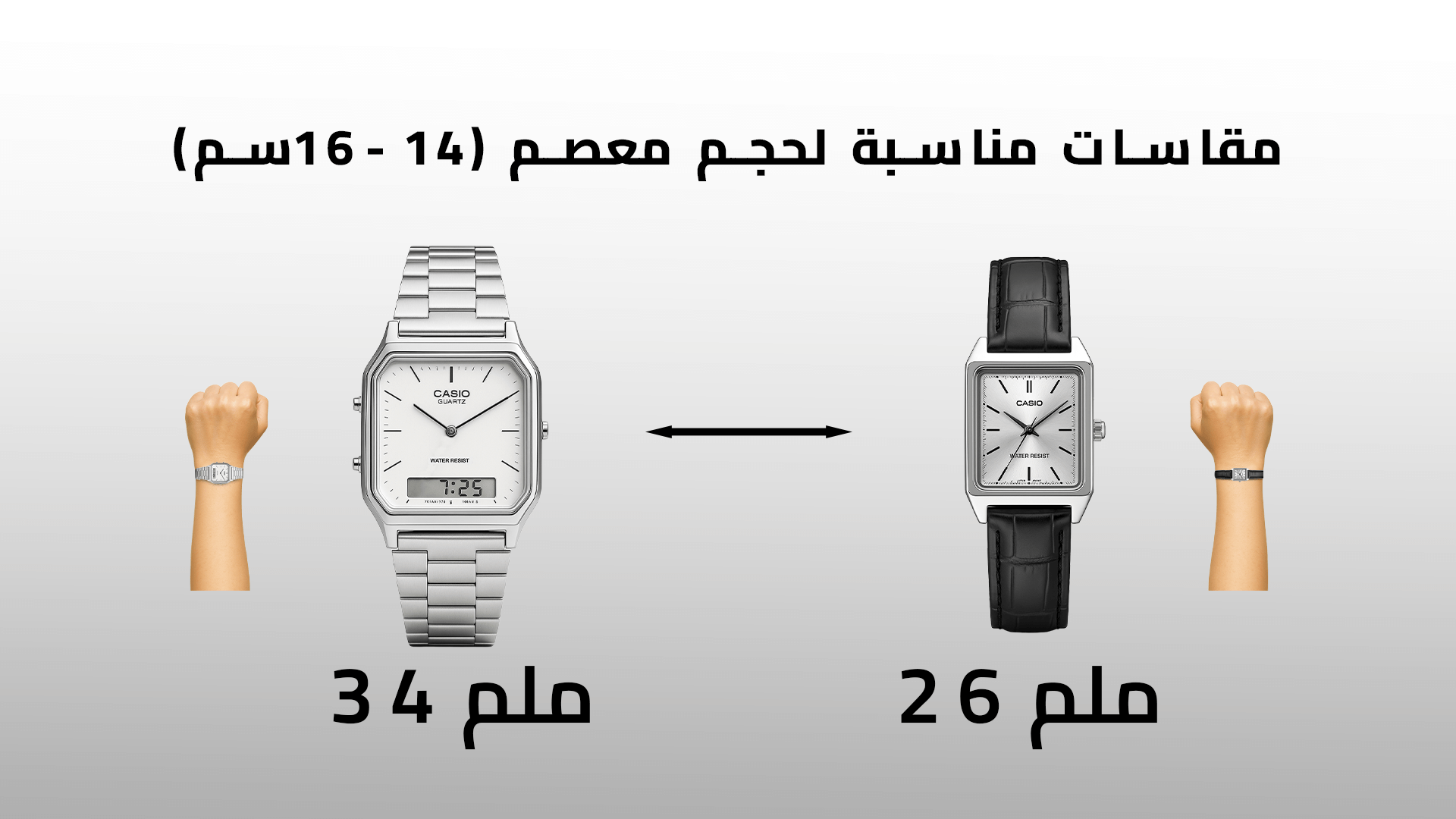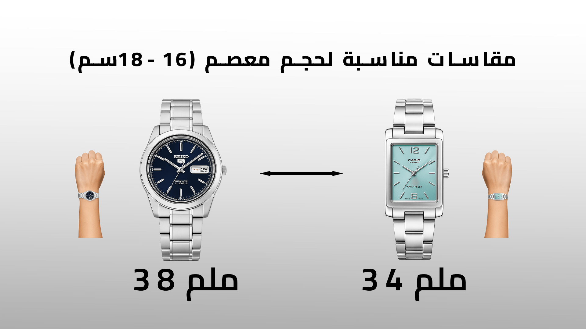 عادةً يتم قياس مقاس الساعة من خلال قطر المينا بالمليمتر مقارنة بحجم المعصم